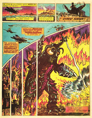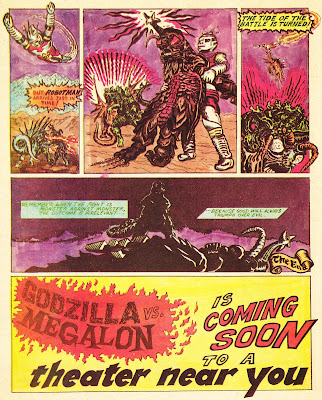 When I went to the theater to see Godzilla Vs. Megalon, they had stacks of these "comics" for the taking. I saw the darn thing three times in a row- this was my chance to commit it to memory in those pre-VCR days. It was a weekend matinee and there were maybe eight people in the audience. Quite a contrast from when I saw Destroy All Monsters a few years earlier, where the theater was packed with cheering kids. Anyone catch GVsM's network premiere in '77 with John Belushi hosting? I did- just before i headed out to my Senior Prom...